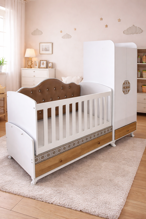 This multifunctional 3-in-1 wooden baby cot bed combines comfort, convenience, and storage in one stylish piece. Featuring spacious drawers and a t...
